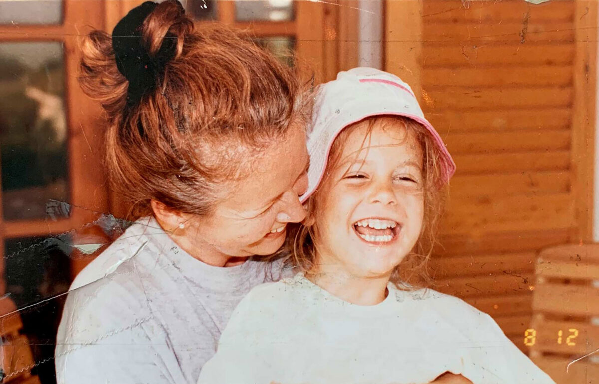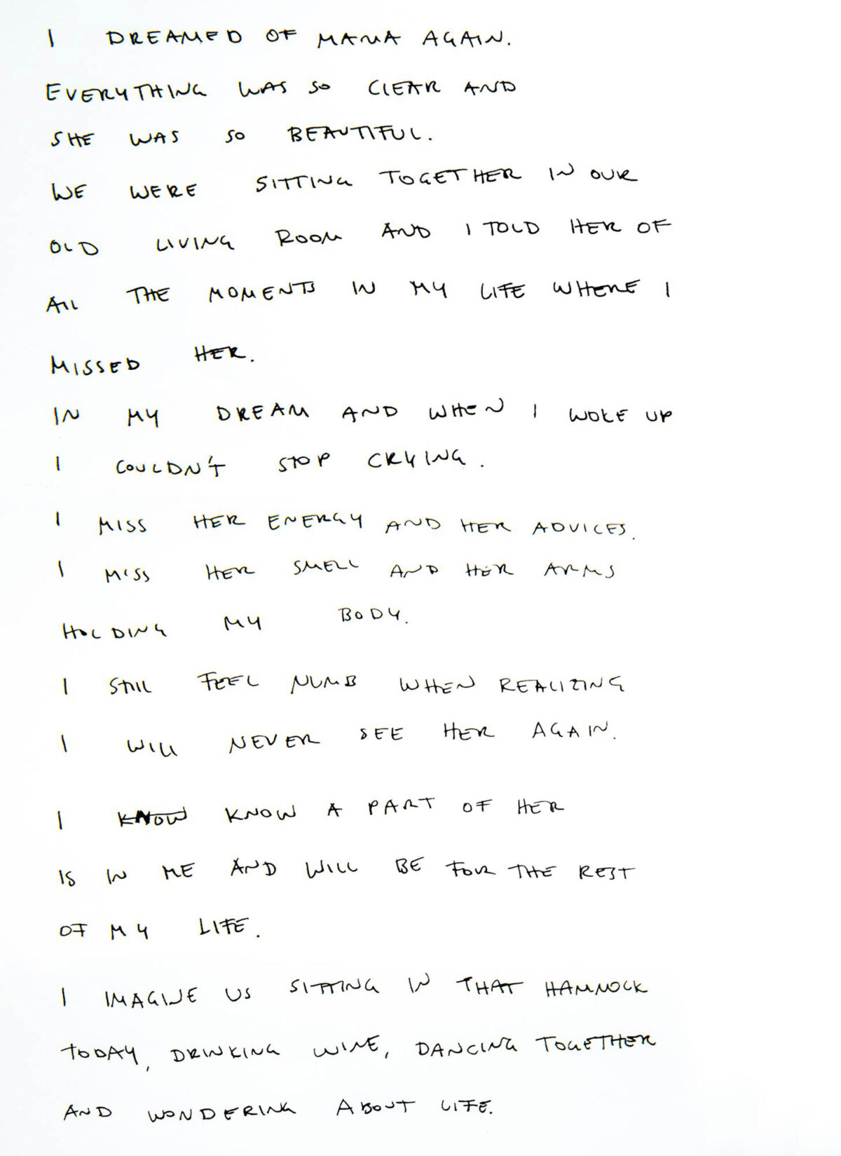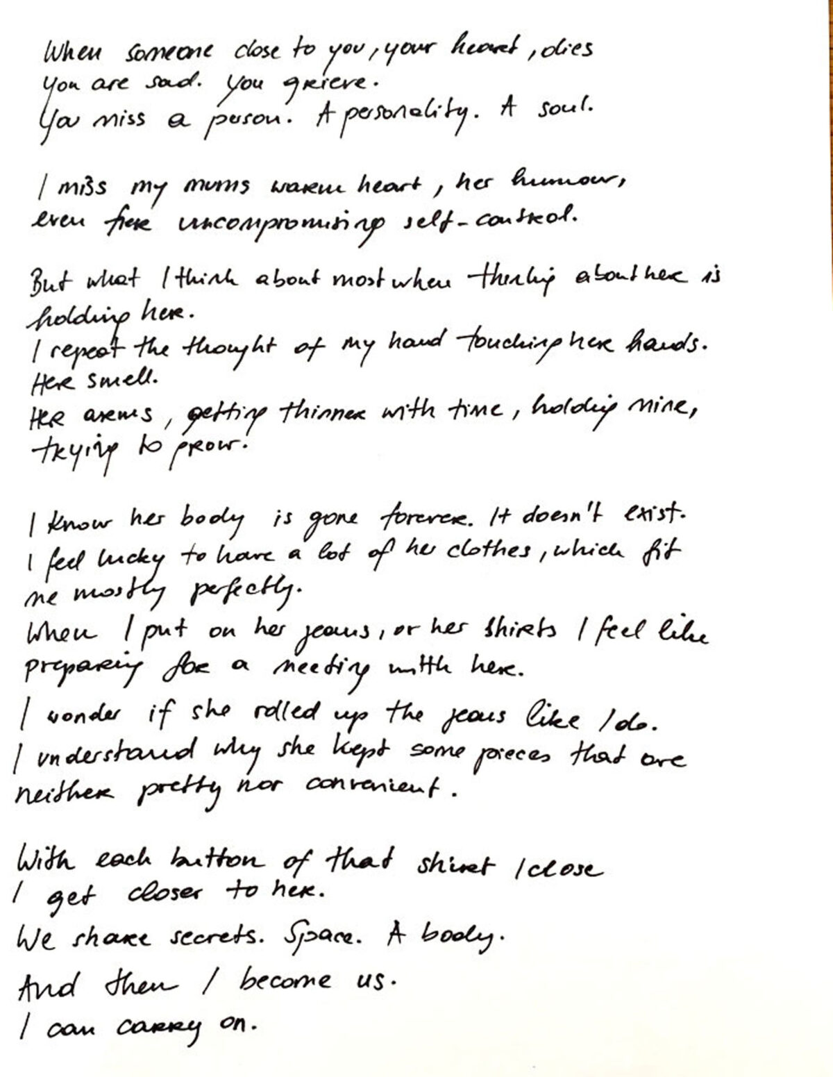 I lost my mother when I was seventeen and I knew I wanted to make a project about her and about this pain of loss, for quite some time. At the beginning I didn’t know how and felt too vulnerable to start the project. But I had this strong longing for exchange and felt the urge to talk to women who have suffered the same loss and who might have similar feelings. I have a lot of clothes from my mother, in which I feel really safe and close to her. This led me to the idea to take a portrait with her, with her on my mind and with her clothes on my body. Not only do these garments build a visual, but also a physical connection, a shared body, between mother and daughter. I wanted to honour and visualise our relationship, even if she’s not around anymore.